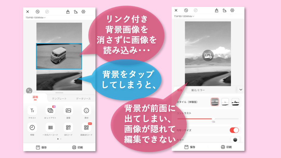プリンターにラベルをセットして、スマホアプリを立ち上げると、コキン!と音がして、接続されます。アプリの画面はこのように↓変わりました。300dpiのラベルをセットすると、最初から画像を読み込むリンク付き背景画像(景色の画像とリンクボタン)が表示されます。